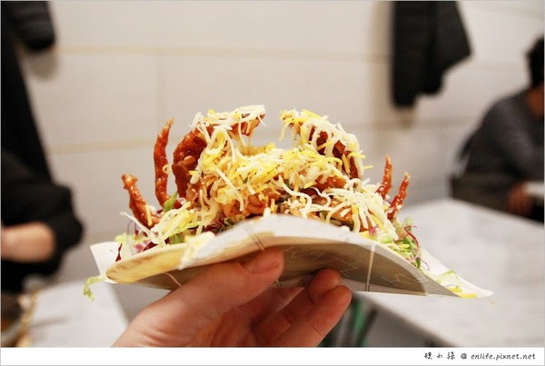 #Kebab捲餅 298元 自己失心瘋點的!我絕對不會說是因為看見了「蟹」這個字的原因 XD(海鮮控又來了~~~這一道餐點可以選兩種肉品(豬、雞、牛、軟殼蟹),自己就選了牛和軟殼蟹!一上桌那澎湃的餡料和份量嚇到我!每一個捲餅都是撐爆快掉料的那種感覺,所以駕馭起來需要點「豪氣」!戀愛中的女孩可能不適合 XD 抓起來豪邁的吃超過癮!裏頭有生菜、起司和特別的醬汁,不嫌不膩其實挺適合夏天的~而且那軟殼蟹是一整隻完整的耶!光是看到它就讓自己立馬抓起來大口咬,酥炸過的軟殼蟹搭著捲餅吃,真過癮!^~^