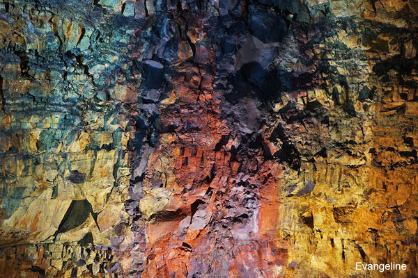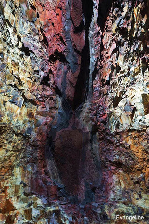 垂降的過程當中,可以非常明顯的看見火山岩漿噴發的整個路徑,跟地科課本畫得一模一樣,課本真的沒有亂畫耶~徹底進入到火山後真的讓人大開眼界,從來沒有想過這麼嚴肅的火山,裡面的石頭卻是這樣的五顏六色。這些都是渾然天成的顏色,沒有加工過就能夠有這樣的色彩,而且看起來是這樣的溫暖。這就是所謂的外冷內熱的概念對嗎XD(雖然火山裡是非常非常冷的,大概5度而已) 岩漿噴發的路徑。